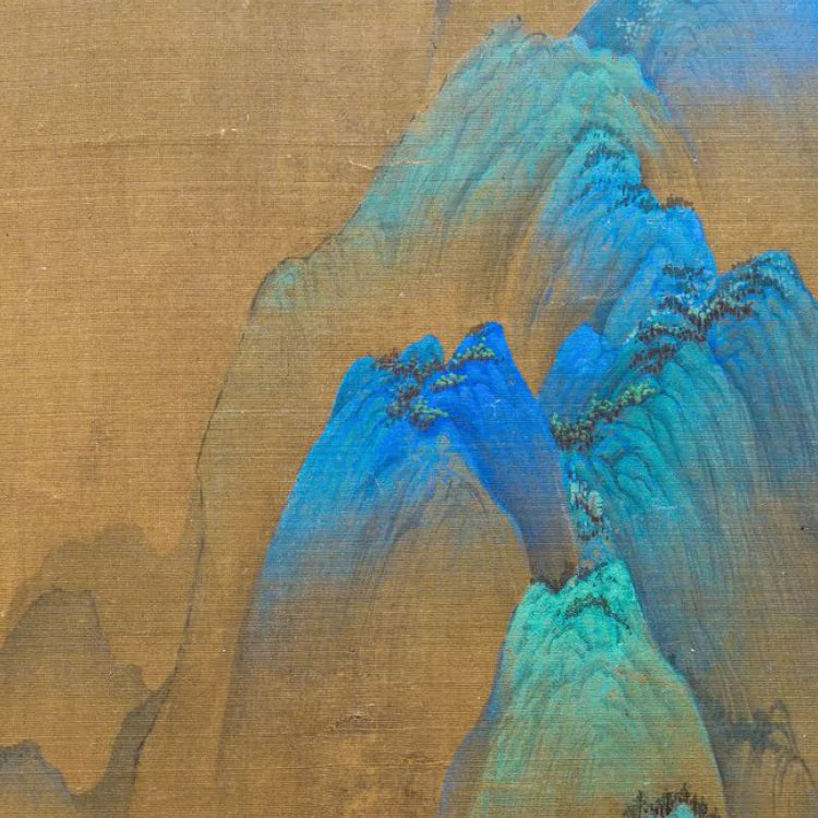 Painted on a 12-meter long silk scroll, this masterpiece is the most representative work of Chinese blue-green landscape paintings.The pattern of the print is inspired by the lush, undulating mountain ranges that rise and fall across the scroll, gracefully twisting among mist-covered waters, multi-layered waterfalls, pavilions, and bustling fishing villages.