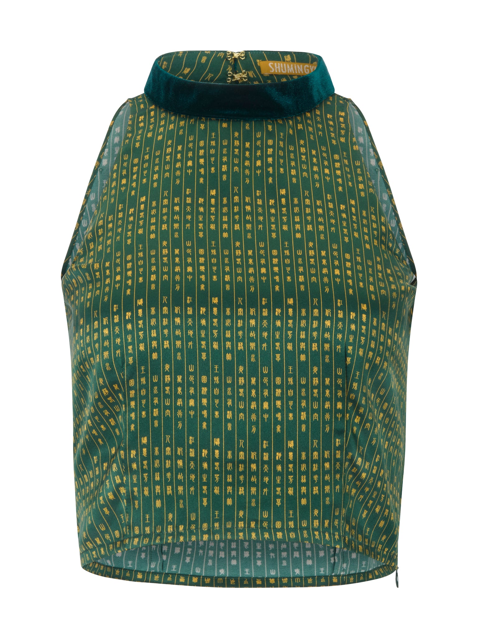 Sleeveless silk crop top featuring the POEM Print and accentuated with a velvet collar.- Printed crop top