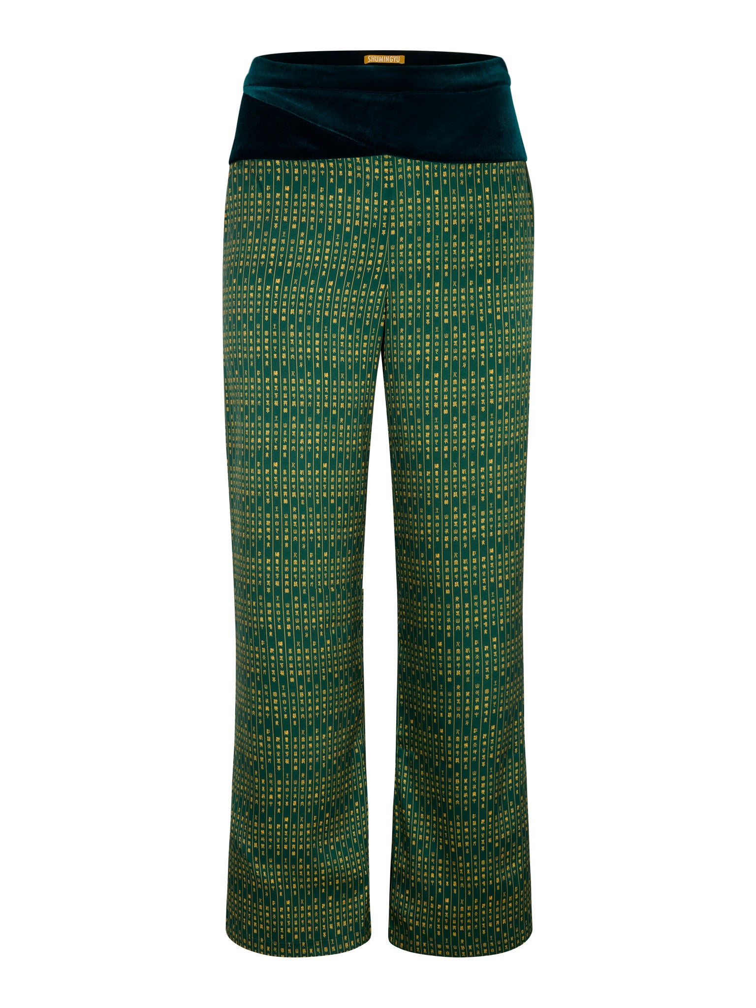 Silk high-waisted pants featuring the POEM Print with a velvet waistband.- Printed high-waisted pants